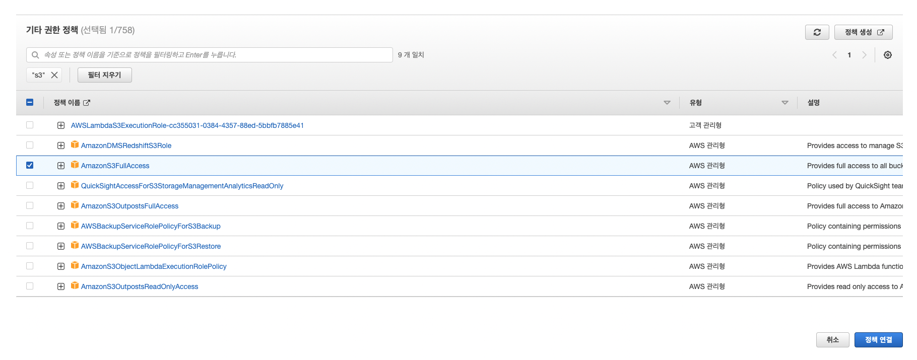 s3 검색 > AmazonS3ReadOnlyAccess 선택 > 정책 연결 클릭
