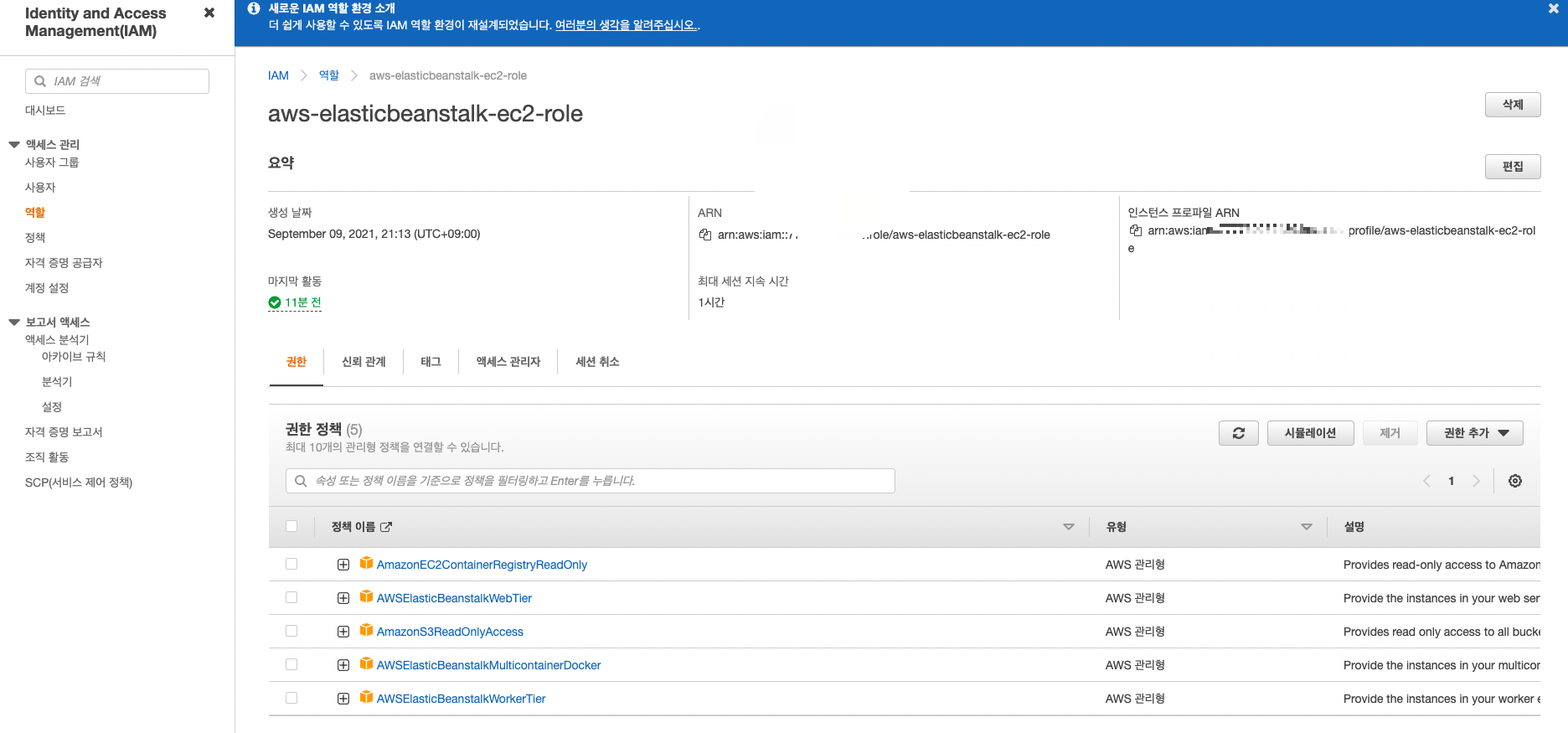 IAM > 역할 > aws-elasticbeanstalk-ec2-role > 권한 추가 > 정책 연결 클릭