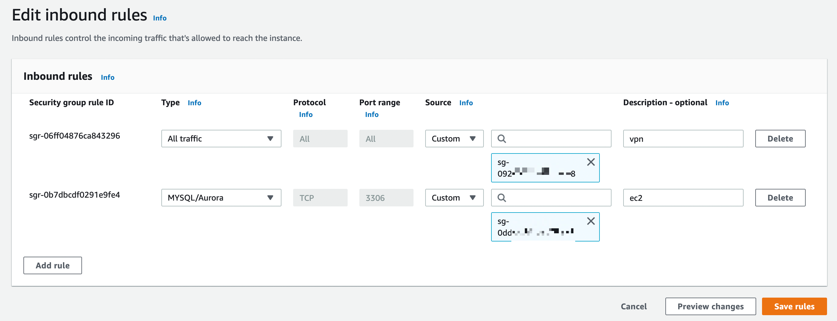 - VPC에서 들어오는 트래픽은 모두 허용해줄 것.